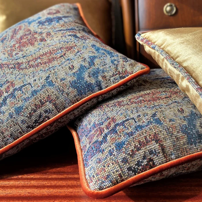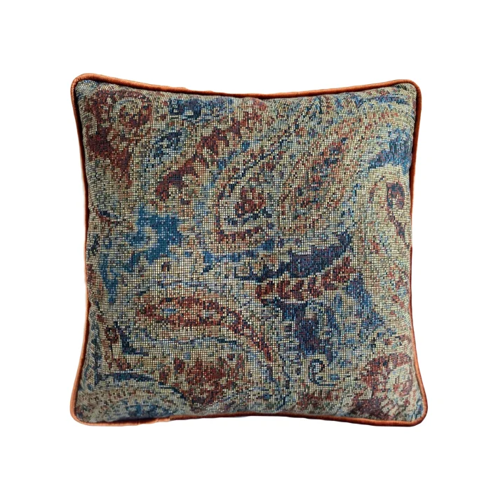 Etrafını çevreleyen ipeksi kadife fitil ile doğal viskon özel dokuma etkin şal desen dekoratif yastık. Dekoratif yastık gizli fermuara sahip ve içi dolu olarak gönderilmektedir