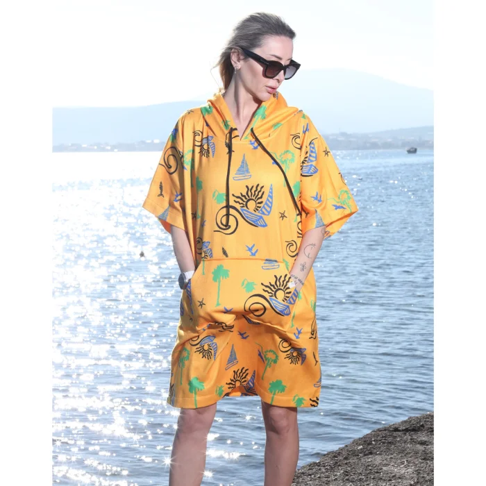 Yenilikçi yan cepleri sayesinde kalabalık ortamlarda bile ıslak mayonuzu kolayca değiştirme imkânı sunar. Önde yer alan kanguru cep, hem şık hem de işlevsel bir detaydır. Unisex kullanım için uygundur ve çocuklardan yetişkinlere kadar her yaş grubuna hitap eder.