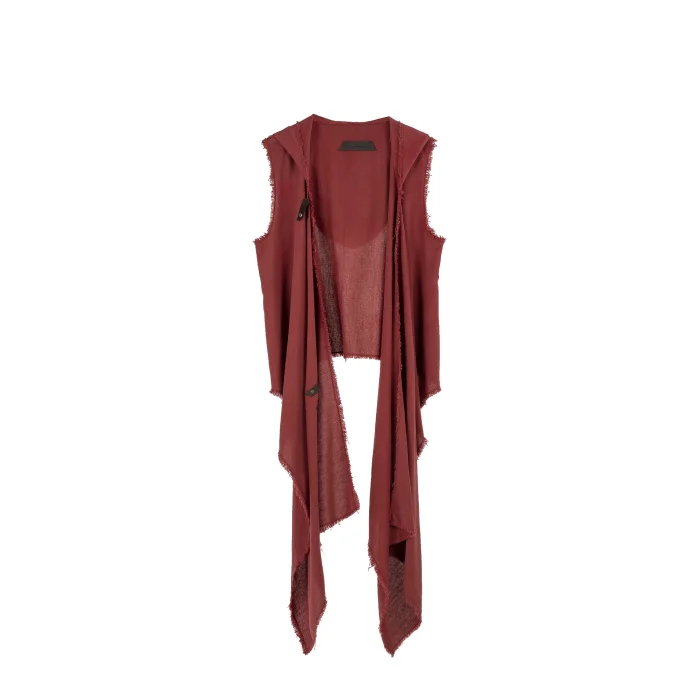 Koruyucu savaşçı benzeri bir başlıkla gelen imza niteliğinde unisex pelerin. Uzun ön kumaşlar omuzların üzerine sarılabilir ve ruhunuzu uyandırabilir. Ön kısımdaki deri kapanış, bu parçayı gizemli bir pelerine dönüştürür. Zamanla, özel boyanmış ve el işi karakterleri bu parçalarda renklerin solması ve derinin eskiyen hale gelmesiyle dönüşüme neden olur, benzersizliğine katkıda bulunur.