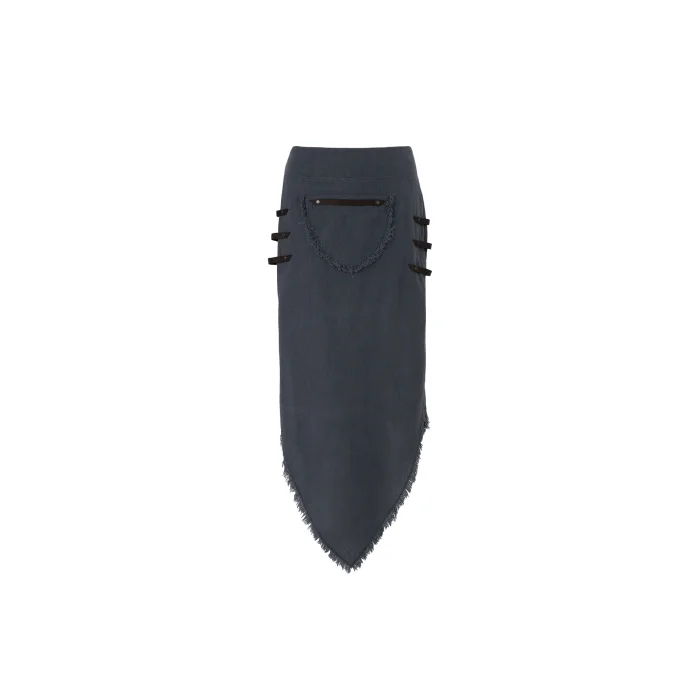 Derin yırtmaçlarla yanlarda uzanan feminen uzun etek, üst bacakların üzerinde deri şeritlerle tutulur ve çekiciliğine katkıda bulunur. Ön cep çantası deri bir kayışla, gezgin ruhunuzu çağrıştırır. Asimetrik kesimli etek ucu, püsküllerle doğal bir akış sağlar. Zamanla, özel boyanmış ve el işi karakterleri bu parçalarda renklerin solması ve derinin eskiyen hale gelmesiyle dönüşüme neden olur, benzersizliğine katkıda bulunur.