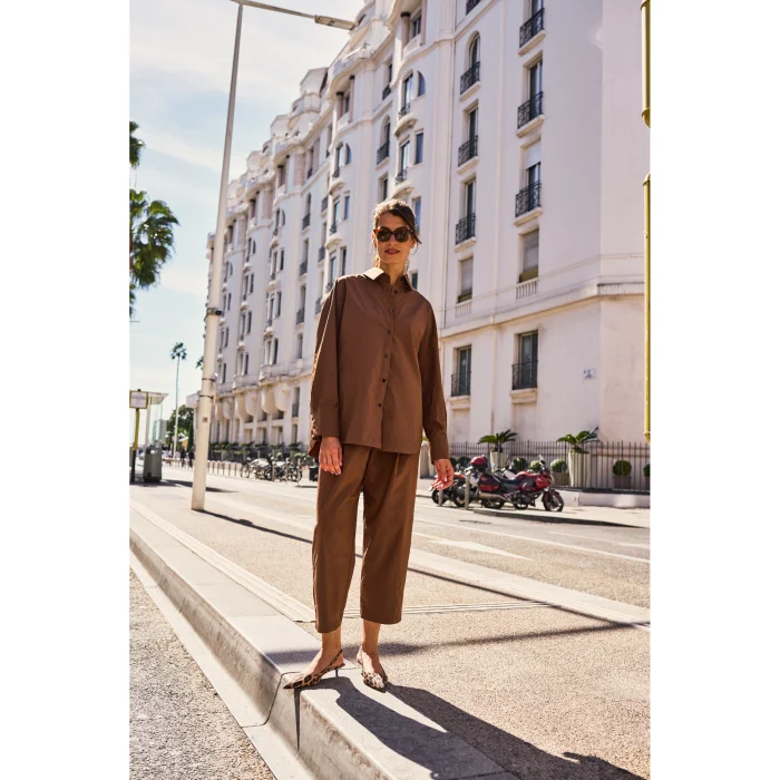 Tek pilili. Beli lastikli. Ütü istemeyen teknik kumaşlı. Yanları iki ceplidir. Bol ve rahat kalıplı. Boyu bilek hizasındadır. Takım gömleği bulunmaktadır.