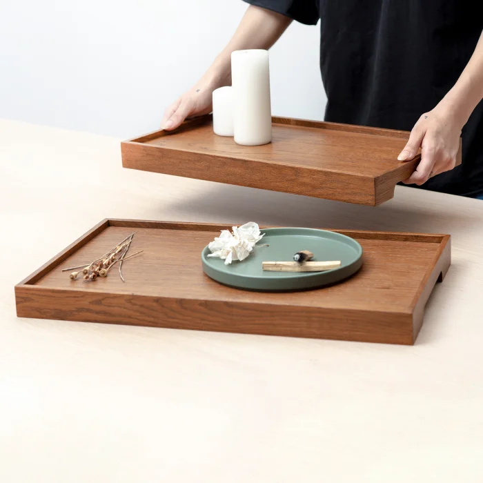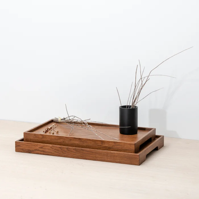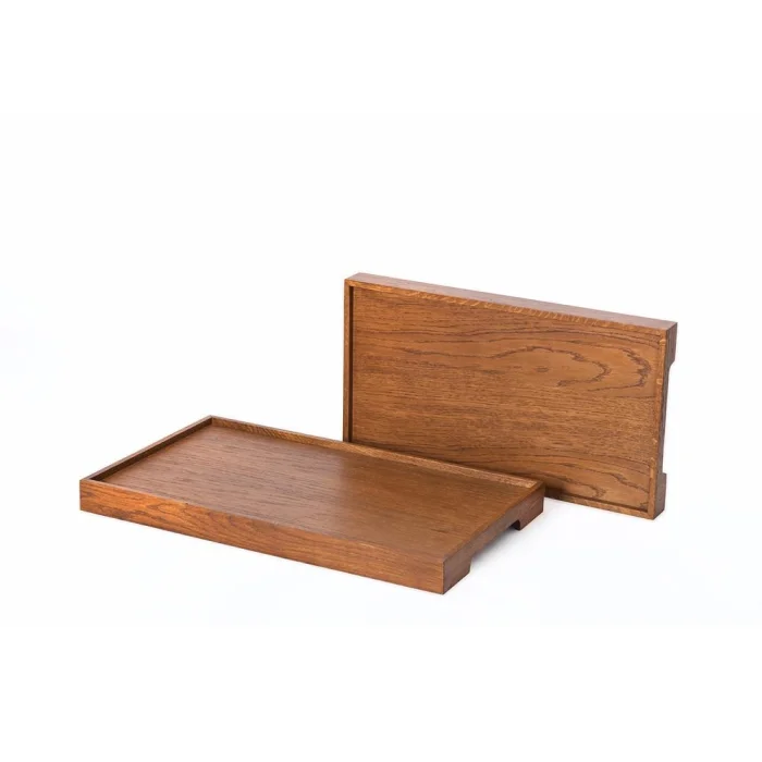 Doğal meşe dokusunu dikdörtgen formun kullanışlılığıyla buluşturan EDGE tepsi seti, servis ritüellerine zanaatkar bir dokunuş katar. Tepsileri çevreleyen yan paneller, fırın kurusu (%7-12 nem oranı) %100 masif meşe ağacından üretilmiştir. Taban kısımlarında ise yapısal stabiliteyi korumak ve ahşabın doğal hareketine bağlı oluşabilecek eğilmeleri önlemek amacıyla birinci sınıf MDF üzerine meşe kaplama tercih edilmiştir. Su bazlı mat cila uygulaması, ahşabı çevresel etkilere karşı korurken doğal rengini ve damar yapısını görünür kılar.