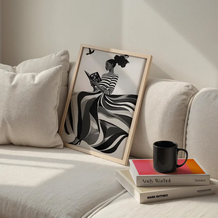 Ev, ofis ve kafe gibi yaşam alanlarında duvar dekorasyonu için idealdir; monokrom çizgileri ve doğal ahşap görünümüyle her stile uyum sağlar.