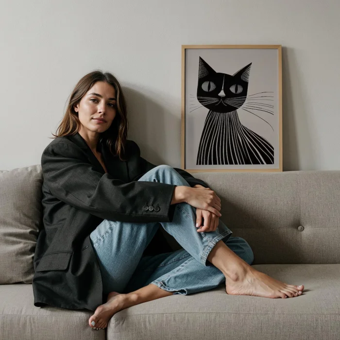 Ürün: Kedi Portre Minimalist Çizgili Ahşap Çerçeveli Tablo