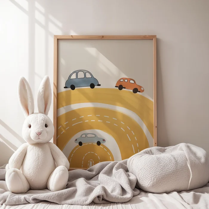 Ürün: Gökkuşağı Yolunda Giden Arabalar Çocuk Odası Ahşap Duvar Tablosu