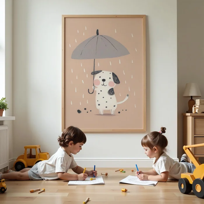 Ürün: Şemsiye Tutan Yağmurlu Hava Köpekçik Çocuk Odası Ahşap Duvar Tablosu