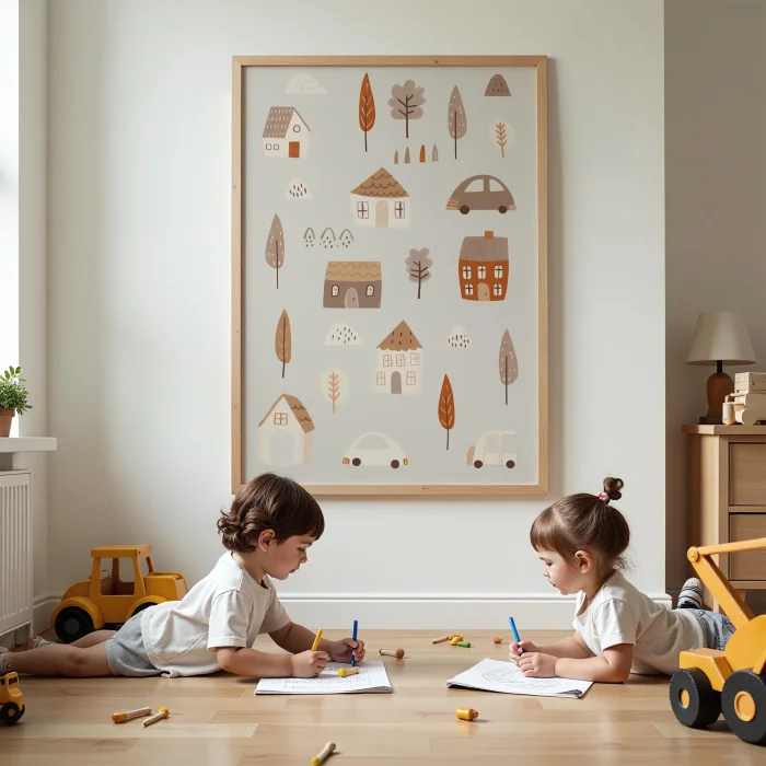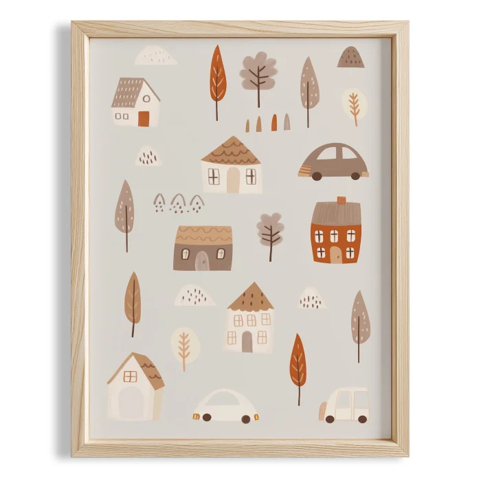 Ürün: Sevimli Evler Ve Kasaba Deseni Çocuk Odası Ahşap Duvar Tablosu