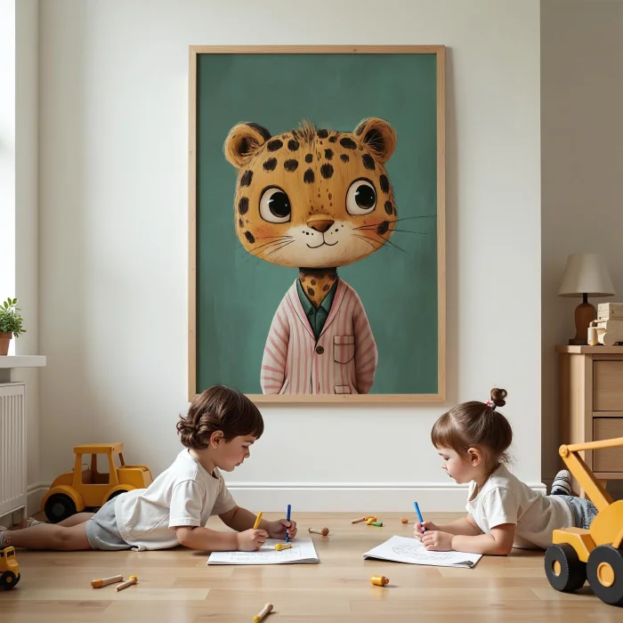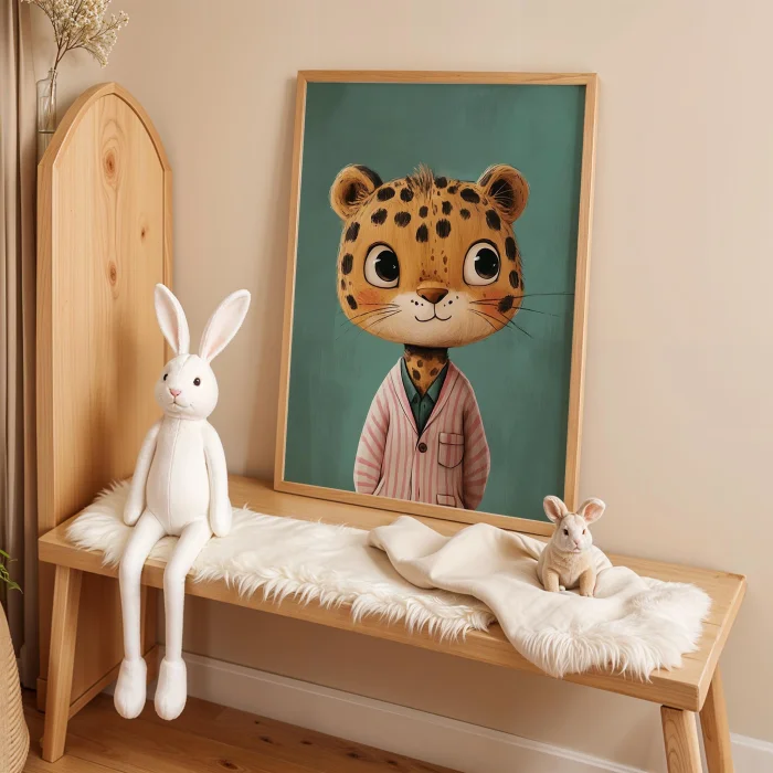 Ürün: Pijamalı Uykucu Kaplan - Fon Doğal Ahşap Çerçeveli Tablo