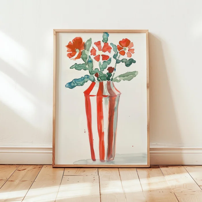 Ürün: Vazo Ve Çiçekler Çizgi Suluboya Ahşap Çerçeveli Tablo