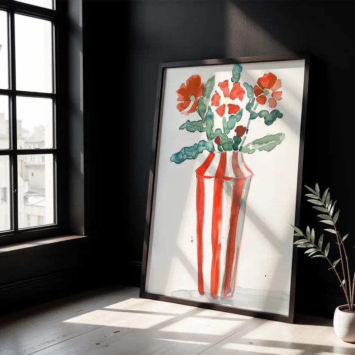 Ürün: Vazo Ve Çiçekler Çizgi Suluboya Ahşap Çerçeveli Tablo