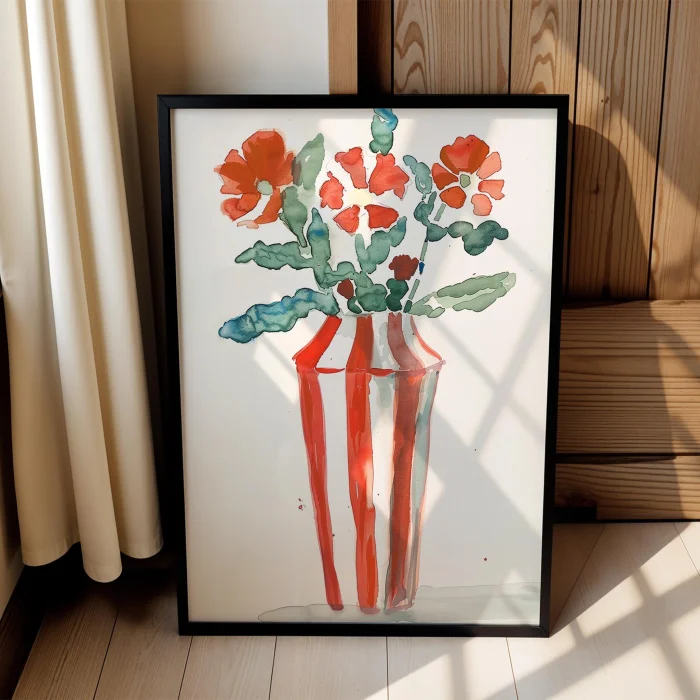 Ürün: Vazo Ve Çiçekler Çizgi Suluboya Ahşap Çerçeveli Tablo
