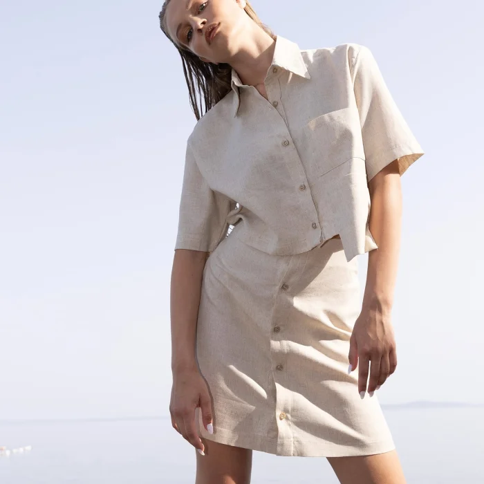 % 77 Cotton Flam - % 23 Linen kumaştan üretilmiştir. Model Ölçüsü Boy: 173cm Göğüs:83 Bel: 60 Kalça: 89. Model S beden giymektedir