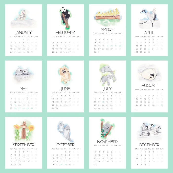 2026'da sizlere eşlik edecek olan tatlı ve sevimli hayvanlar takvimi, küçük dostlarımızın kalpleri ısıtan görselleri ile masalarınızı süslemek için tasarlanmıştır. Suluboya illüstrasyonlar, 300 gr dokulu, kalın suluboya kağıdı üstüne basılmıştır. Takvim seti 12 ay ve 1 kapak sayfası olmak üzere toplam 13 yapraktan oluşmaktadır. Her bir yaprağın boyutu 10.5x14.8 cm'dir. Hafta sonları gri renkle, resmi tatiller yeşil renkle, diğer günler ise siyah renkle yazılmıştır. Takvim standı gönderilmemekte, yalnızca takvim yaprakları gönderilmektedir. Baskı sonrasında kağıtta yapılan kesim işlemi sebebiyle ölçüler 2-3 mm farklılık gösterebilir.