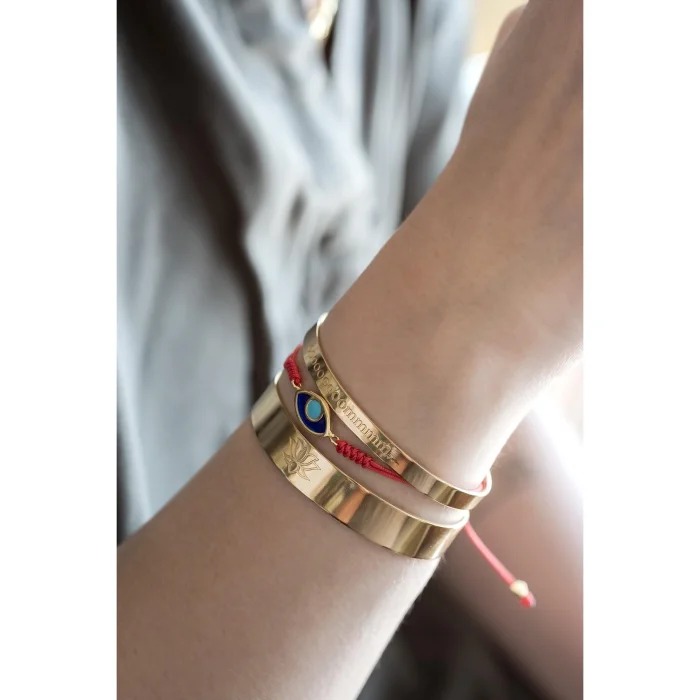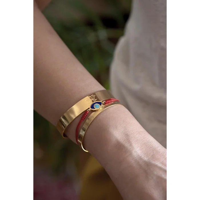 Pirinç üzerine 24K mikron altın kaplama lotus çiçeği detaylı kelepçe bilekliğin çapı 6 cm olup esnek malzemesiyle ayarlanabilmektedir.