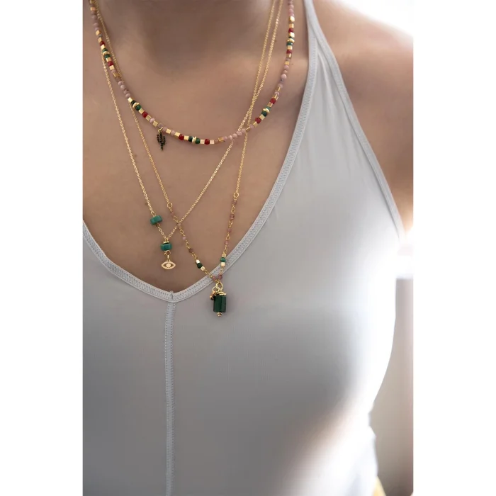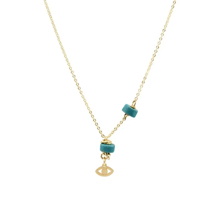 Pirinç Üzerine 24K Mikron Altın Kaplama Minimal Göz Detaylı Kolye Turkuaz Taşı Kullanılarak Tasarlanmış Olup Uzunluğu 55 cm'dir.