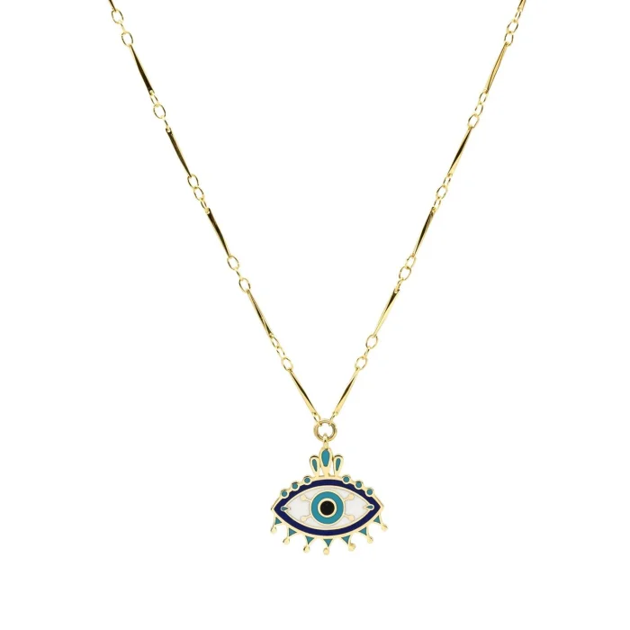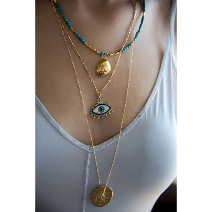 Pirinç Üzerine Altın Kaplama Lacivert, Turkuaz, Beyaz Renklerinde Soğuk Mineyle Renklendirilmiş Göz Kolyenin Zincir Uzunluğu 50 Cmdir.