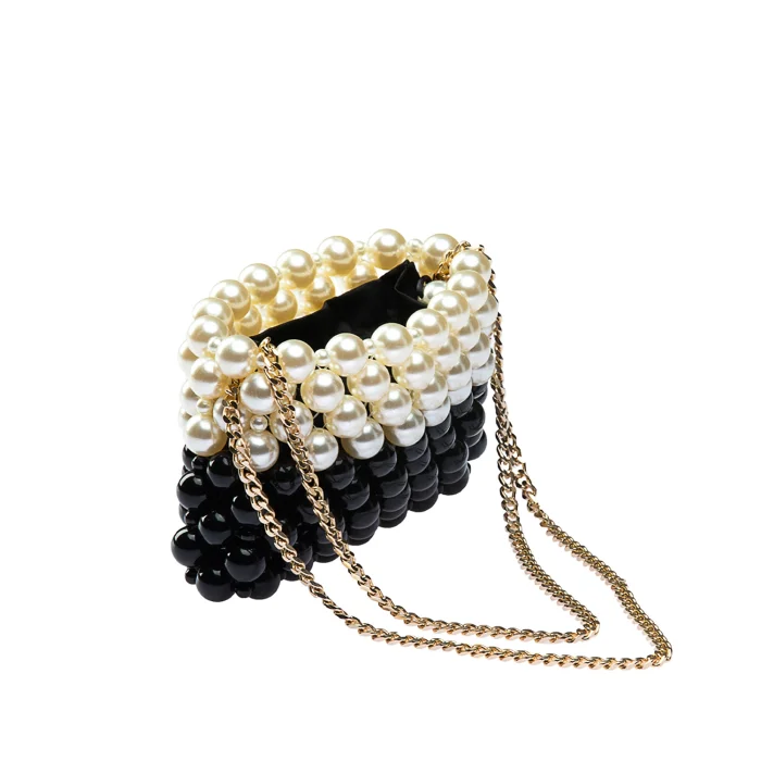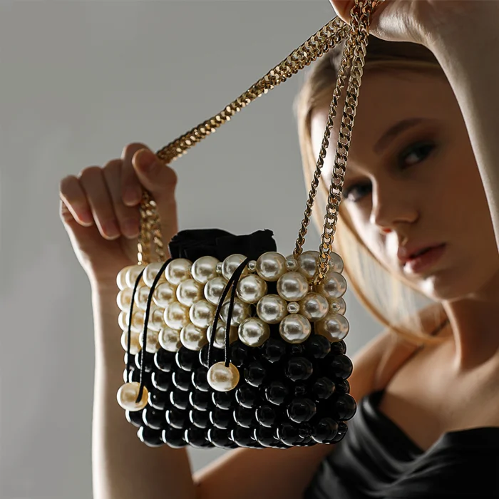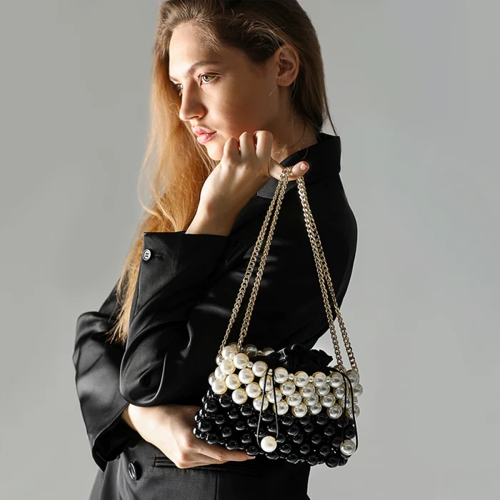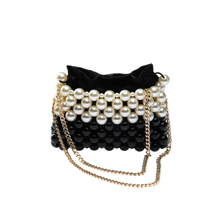 Lüks inci ve siyah boncuk çanta. 25+kg direnç kapasiteli misinayla örülmüştür. Dupont saten büzgü kapamalı iç kese, altın kaplama zincirli. Özel tasarım, %100 el yapımı.