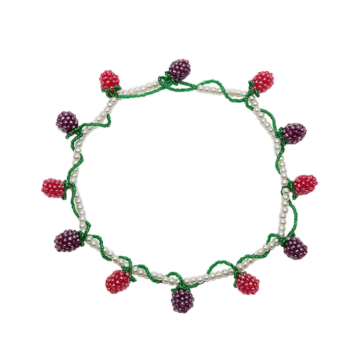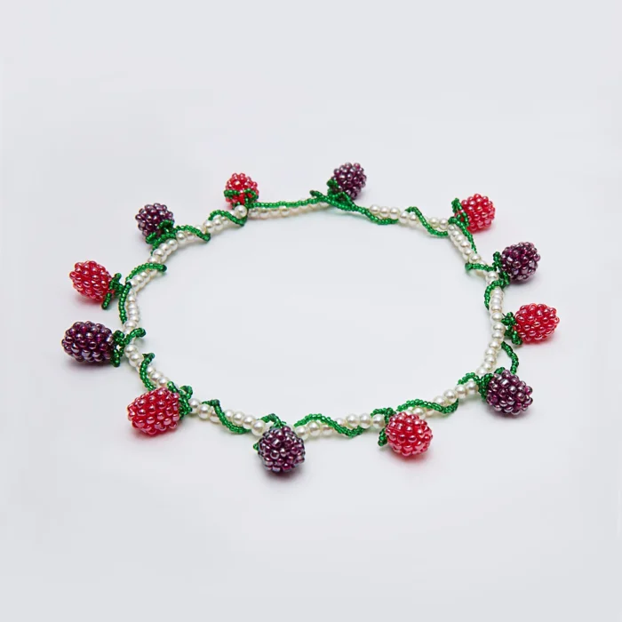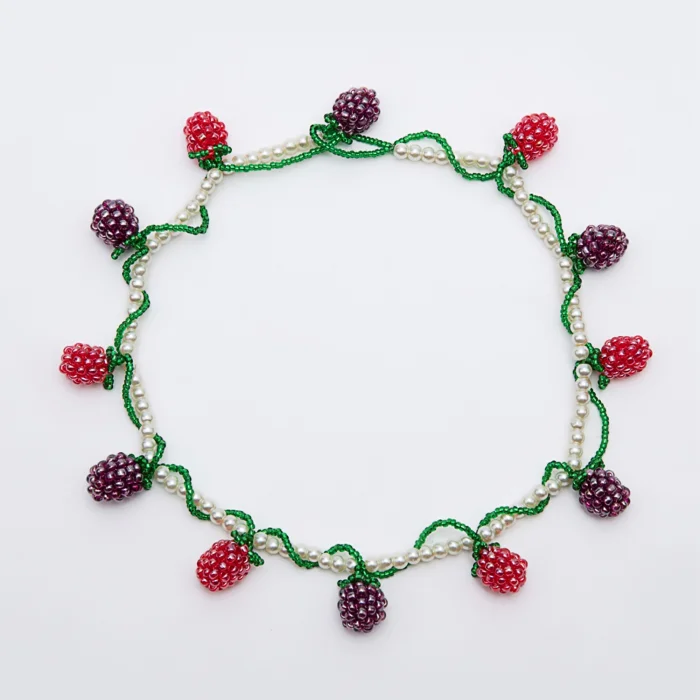 Milimetrik cam kum boncukların uzun saatler boyu misina ile örülmesi ile meydana getirilmiştir. Özel tasarım, El yapımı.