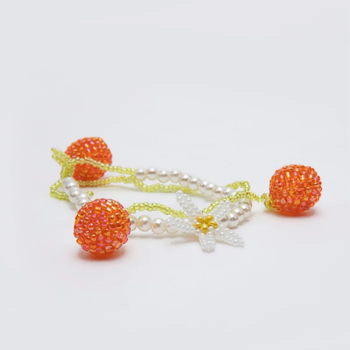 Milimetrik cam kum boncukların uzun saatler boyu misina ile örülmesi ile meydana getirilmiştir. Özel tasarım, El yapımı.