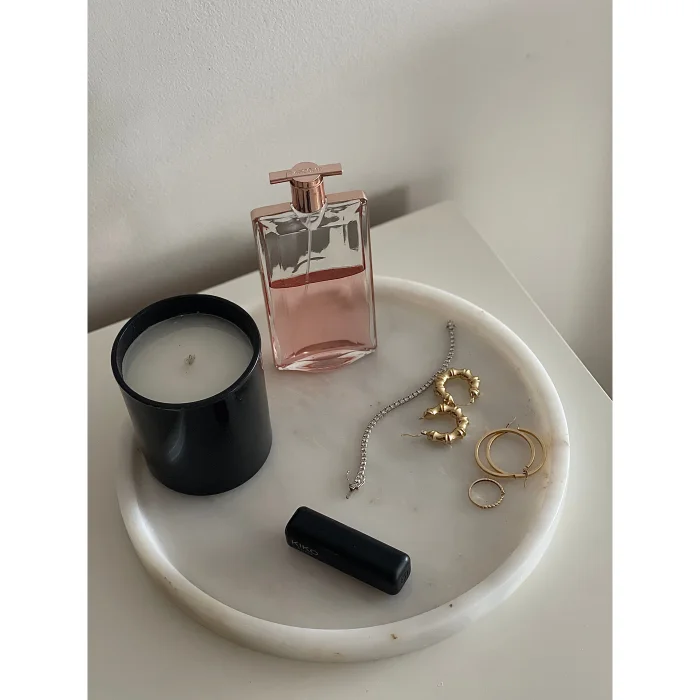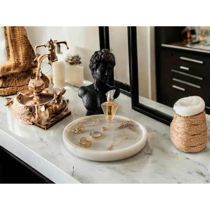 - Malzeme : Beyaz üzeri gri tonlarında damarlı mermer