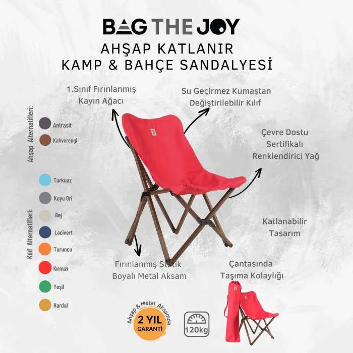 Açık hava keyfini dilediğiniz her yere taşımanızı sağlayan Bag The Joy Ahşap Kamp ve Bahçe Sandalyesi, doğa tatilleri, bahçe keyfi ve pikniklerinizin vazgeçilmezi olacak. Birinci sınıf fırınlanmış kayın ağacından ürettiğimiz ve çevre dostu ahşap koruyucu yağ ile renklendirdiğimiz değiştirilebilir kılıf özellikli Bag The Joy Ahşap Katlanan Sandalyemiz, Bag The Joy Ahşap Katlanır Rulo Kamp Masası ile açık hava keyfinize şıklık ve rahatlık katacak. Sandalyeniz su itici özellikli oturma kılıfı ve omuz çantası içinde katlanmış olarak taşınır, kurulum gerektirmez. Kompakt ve hafif tasarımlıdır. • Açık hava şartlarında kullanılabilir • Ahşap iskeleti 1. Sınıf fırınlanmış kayın ağacından üretilir • Çevre dostu, gıdayla temasa uygun, sertifikalı koruyucu yağ ile renklendirilir • Statik fırında boyanmış metal aksama sahiptir • Su itici özellikli çantasında omuzda taşınabilir • Su itici özellikli oturma kılıfı değiştirilebilir, yenilenebilir • Yerli üretim ÖLÇÜLER: • Açık: Yükseklik: 85cm / Genişlik: 55cm / Derinlik: 64cm • Kapalı: Yükseklik: 96cm / Genişlik: 14cm / Derinlik: 9cm • Çantada: Yükseklik: 103cm / Genişlik: 20cm / Derinlik: 10cm • Ağırlık: 2,950 g (+/-50g) • Tavsiye edilen taşıma kapasitesi max. 120 kg’dır. ÜRÜN İÇERİĞİ: • 1 Adet ahşap katlanır sandalye (kahverengi) • 1 adet oturma kılıfı (kırmızı) • Su itici özellikli sandalye çantası (kırmızı)