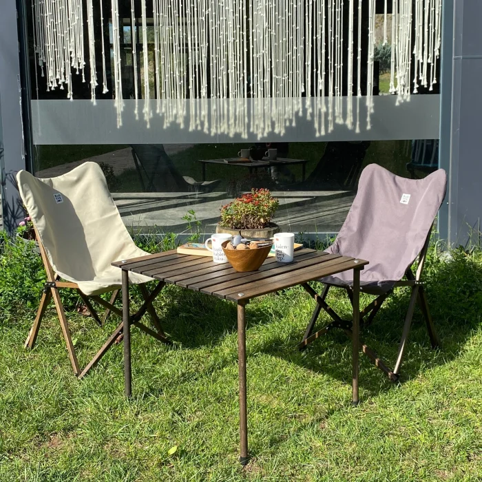 BAG THE JOY 50*50*50cm AHŞAP RULO KATLANIR KAMP & PİKNİK MASASI + 2 ADET AHŞAP KATLANIR KAMP SANDALYESİ – KOYU GRİ KILIF