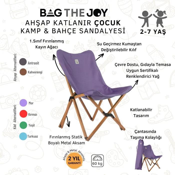 Birinci sınıf fırınlanmış kayın ağacından ürettiğimiz ve çevre dostu, gıdayla temasa uygun, EN71-3 Oyuncak Güvenliği Sertifikalı ahşap koruyucu yağ ile renklendirdiğimiz, değiştirilebilir kılıf özellikli Bag The Joy Ahşap Katlanan Çocuk Sandalyemiz, çocuklarınızla geçireceğiniz açık hava keyfinize şıklık ve rahatlık katacak.