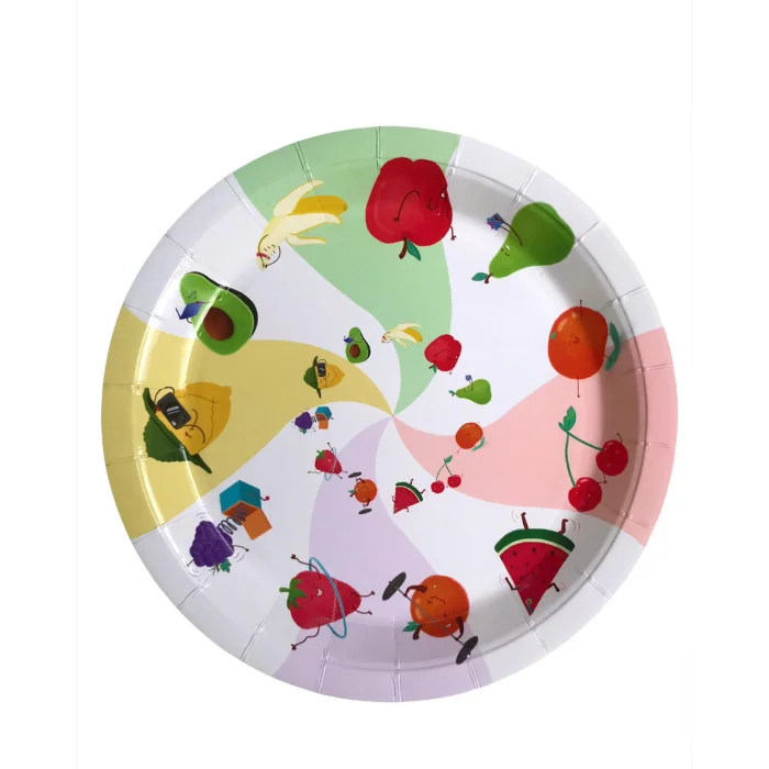 8’li karton tabak seti. Ürün boyutu: 22 cm x 22 cm. Meyveler desenli, özel tasarımdır. Gıdaya temasa uygundur.