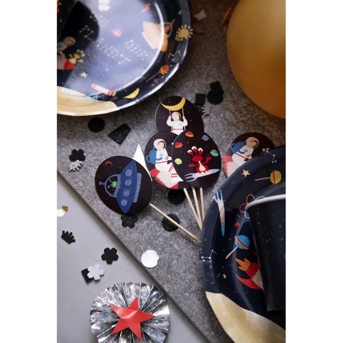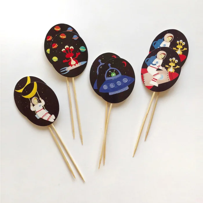Pakette 8 adet pasta ve atıştırmalık üstü süsü bulunmaktadır. 4 farklı astronot, roket ve uzay gemili desen kullanılmıştır, özel tasarımdır. Bambu çubuk üzerine elips kartonun en: 5 cm, boy: 6 cm. Bambu kürdan ile birlikte uzunluğu: 15 cm