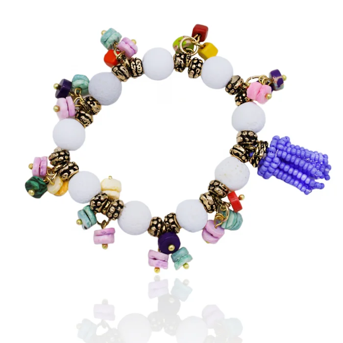 Üretim Şekli : El Yapımı Bileklik Materyal : Hint püskülü, howlite taşı, sedef taşı, mercan taş, 22 ayar altın kaplama pirinç Uzunluk : Tüm bilek ölçülerine göre ayarlanabilir lastikli bileklik Ağırlık : 30 gr