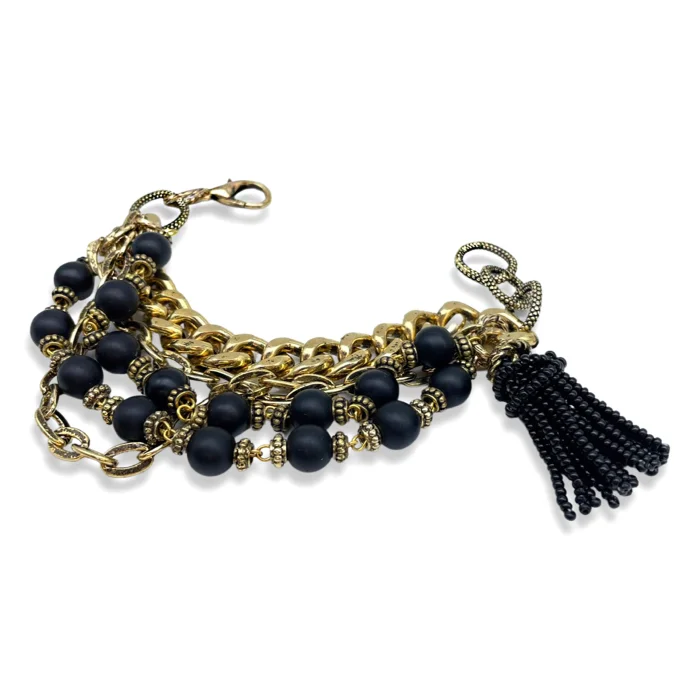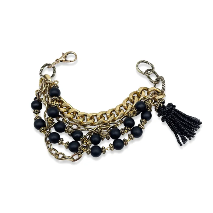 Üretim Şekli : El Yapımı Bileklik Materyal : 22 ayar altın kaplama çelik zincir, siyah oniks taşı, hint püskülü Uzunluk : 17 cm + 5 cm uzatma zinciri