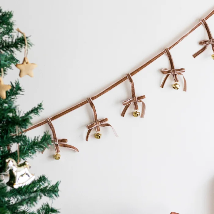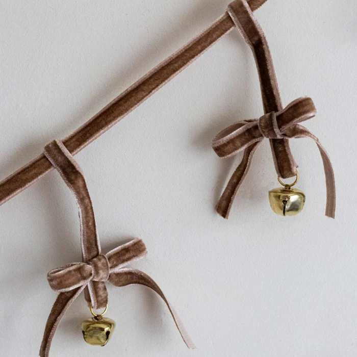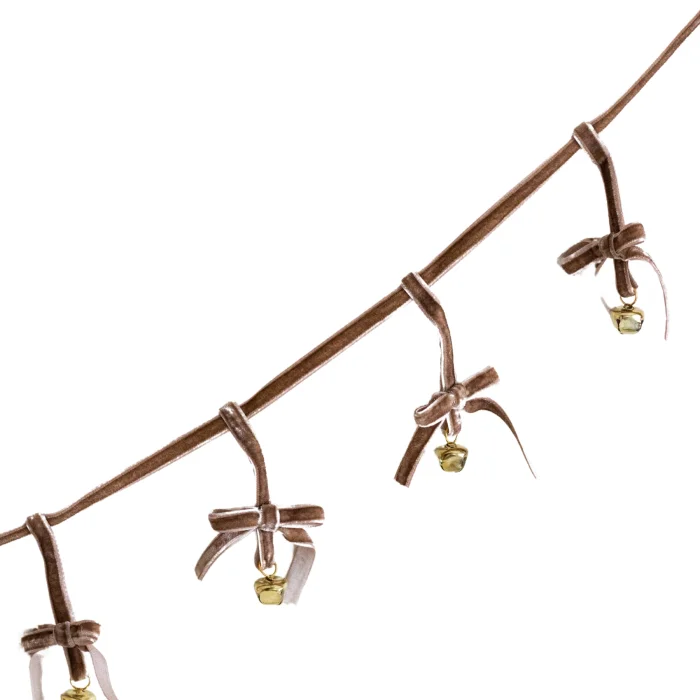 Beige & Stone yılbaşı koleksiyonundaki "Kadife Çan Kurdele Zinciri" ile ağacınızı, merdiveninizi veya şöminenizi gerçek bir geleneksel noel tarzında süsleyin. Her biri on açık kahverengi fiyonklu ve altın çanları mevcut. Miktar: 1 Boyutlar: Toplam: Y 10 x u 140cm Altın çanlar: Çap 2cm Kadife kurdele ve demir çanlardan yapılmıştır. Her zincir 10 yay ve çandan oluşur.