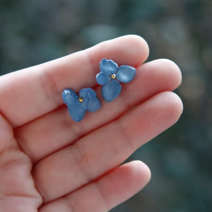 İçinde kurutulmuş gerçek ortanca çiçekleri bulunan paslanmaz çelik & reçine küpe.