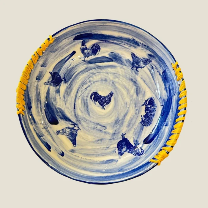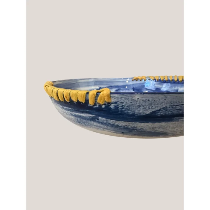 Kenarı iple dekore edilmiş bu özgün tasarım stoneware çamurundan döküm tekniği ile üretilmiştir. Elde desenlenmiş ve dekal baskı tekniği kullanılmıştır.