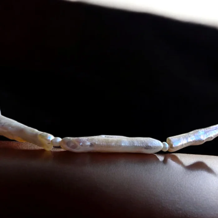 Uzun çubuk kültür incileri ve kum inciler ile tasarlanmıştır.