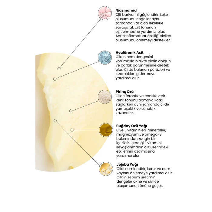 Niasinamid: Cilt bariyerini güçlendirir. Leke oluşumunu engeller aynı zamanda var olan lekelerle savaşarak cilt tonunun eşitlenmesine yardımcı olur. Anti-enflamatuar özelliğe sahip olduğundan sivilce oluşumunu önlemeyi destekler.