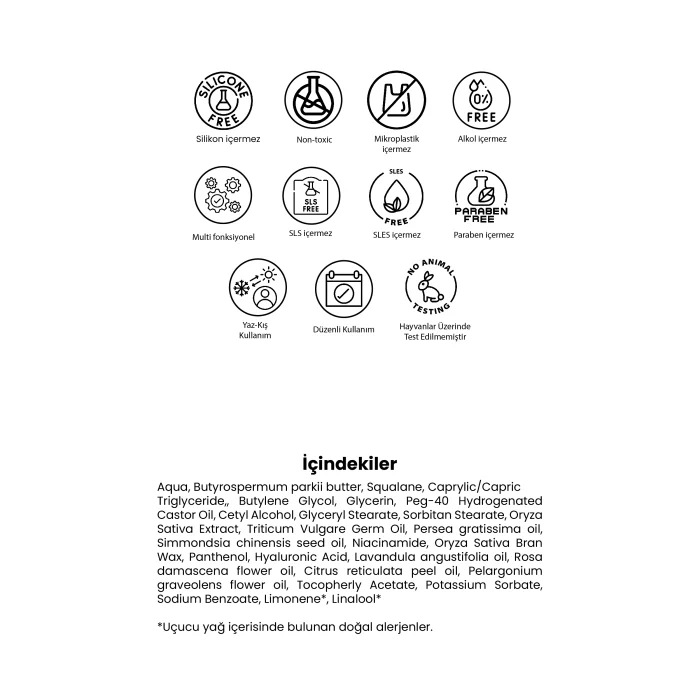 Kullanımı: Cildinize uygun nazik bir temizleyici ile cildinizi arındırın. Elinize yeterli miktarda ürün alarak ısıtın ve cildinize dairesel hareketler ile uygulayın.