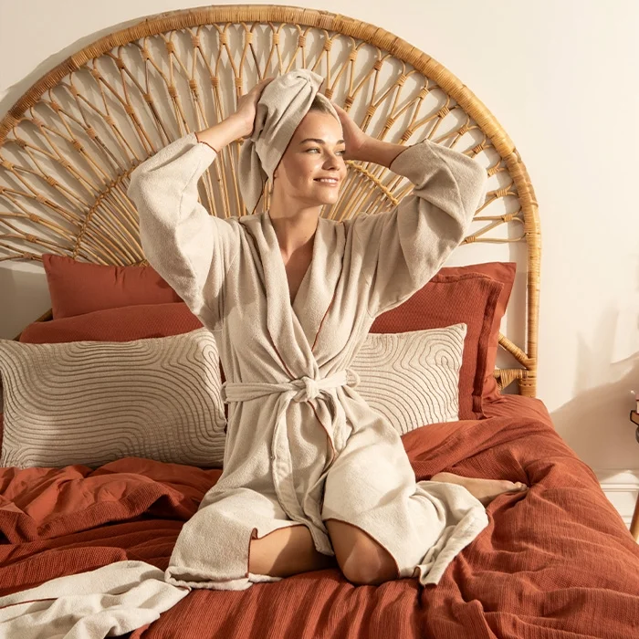 İkigai bornoz, gündelik rutinlerin arasında kaybolmuş ruhları yeniden uyandıracak felsefe ile tasarlanmıştır. İnce dokusu sayesinde hafif ve kullanımı son derece rahattır. Ayrıca, özel kumaş yapısı sayesinde hızlıca kurur, böylece her kullanımdan sonra hemen tekrar kullanıma hazır hale gelir. 100% Pamuk Omuzdan Uzunluk: 1 Beden (S-M): 118 cm 2 Beden (L-XL): 120 cm