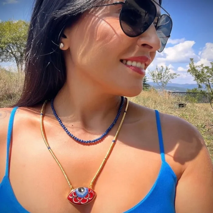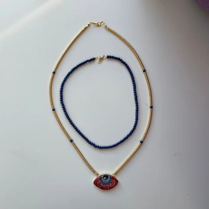 Gold kırmızı porselen göz uzun çiftli set kolye Gold aparatları kararmaz birinci sınıf kaplamadır. Gögüs hizasında uzun kolyedir. İçteki ikinci kolye lacivert boncuklu ve ayrı olarak kullanılabilir.
