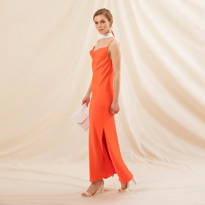 Kendi suni deri zarf çantasından çıkan, degaje göğüs detaylı krep saten kumaştan üretilmiş , ayarlı askılı, eteği yırtmaçlı bilekte elbise.