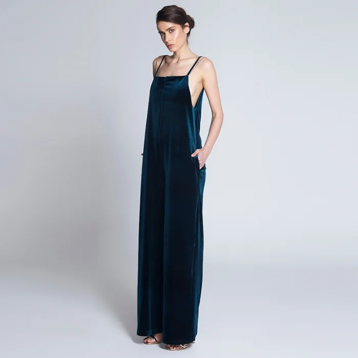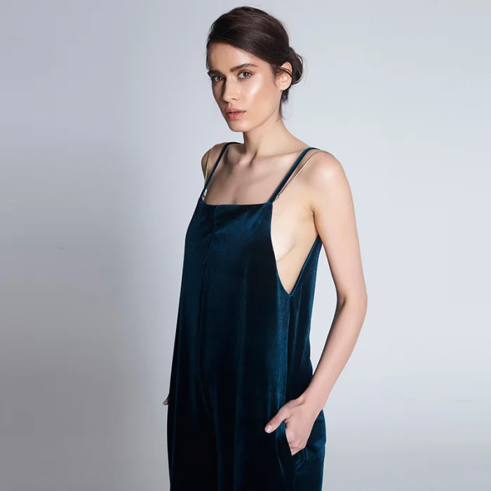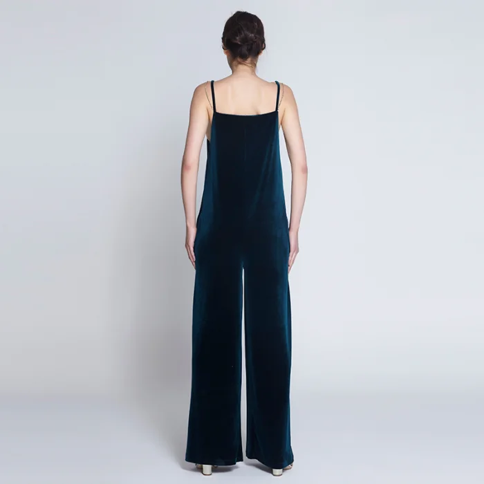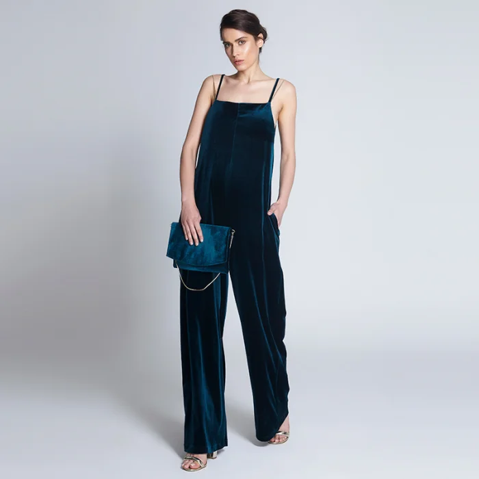 Kadife C-ya nakışlı çantasının içinden çıkan, askılı cepli krep oversize kadife tulum. Askı olarak ya da çantasına zincir veya aksesuar olarak kullanılabilecek 2 adet zinciri mevcut.