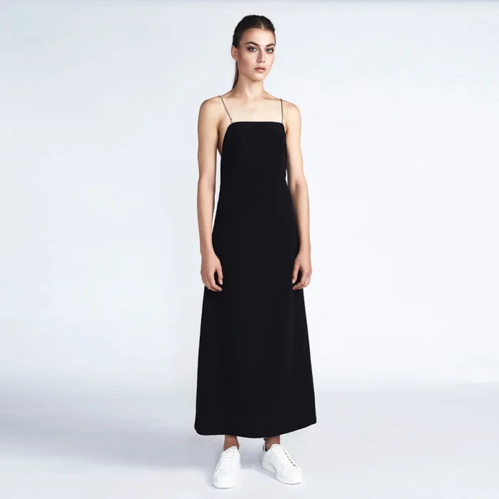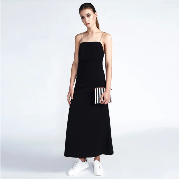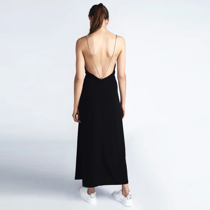 Siyah beyaz çizgili C-ya çantasının içinden çıkan, sırt dekolteli krep kumaştan üretilen elbise. Farklı şekillerde kullanılabilecek 4 zinciri mevcut. Zincir kaplaması Nikel.