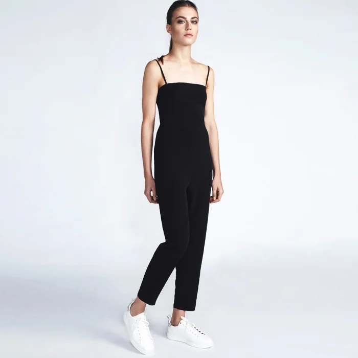 Siyah beyaz çizgili C-ya çantasının içinden çıkan, askılı ve straplez olarak giyilebilen krep kumaştan üretilen, tulum. Sırt dekoltesi farklı stillerde kullanılabilir.