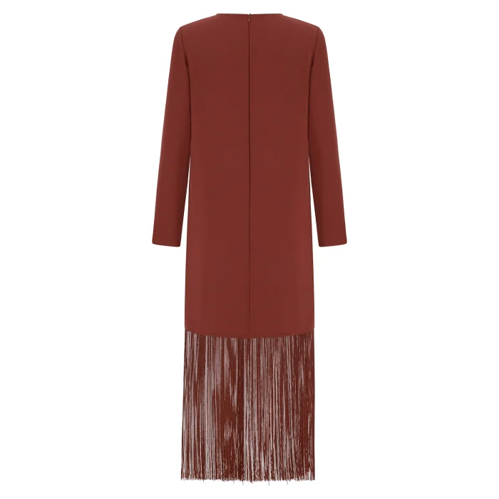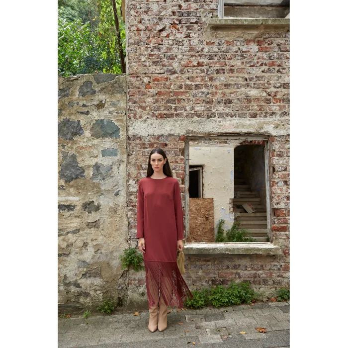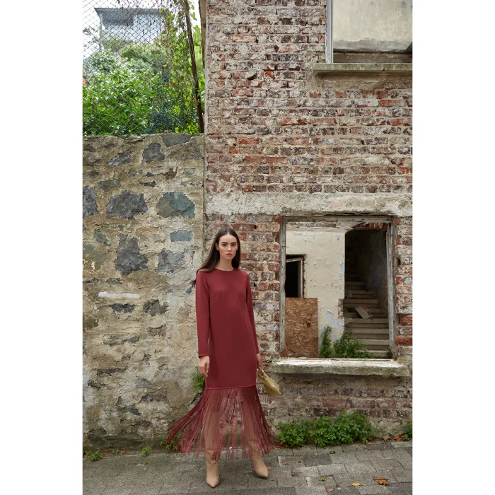 Kendi zirh file çantasından çıkan, eteği püskül detaylı Uzun kollu bisiklet yaka krep kumaştan üretilmiş, bilekte elbise.