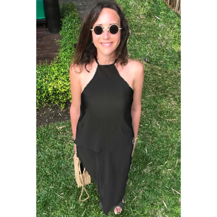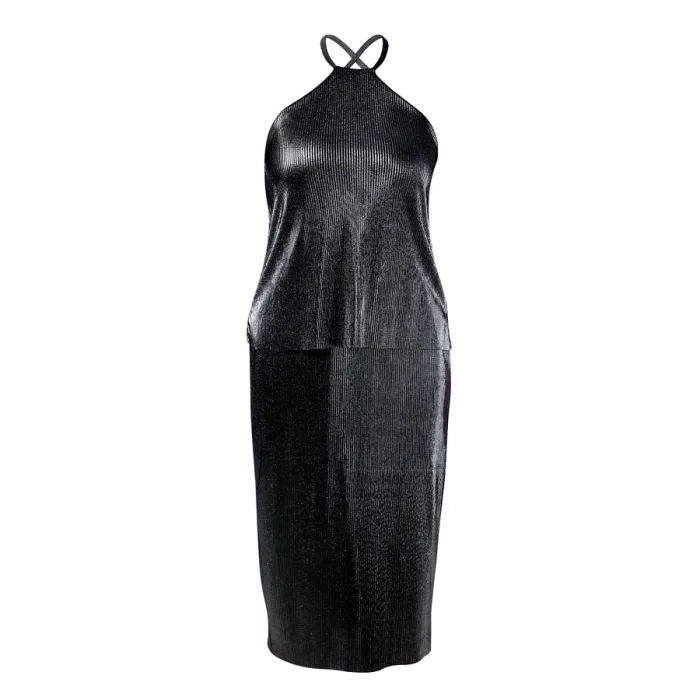 Kendi C-ya çantasının içinden çıkan kırışmayan kumaştan üretilen, yan dikişlerden yırtmaçlı çift taraflı giyilebilen kayık yaka krinkle elbise.