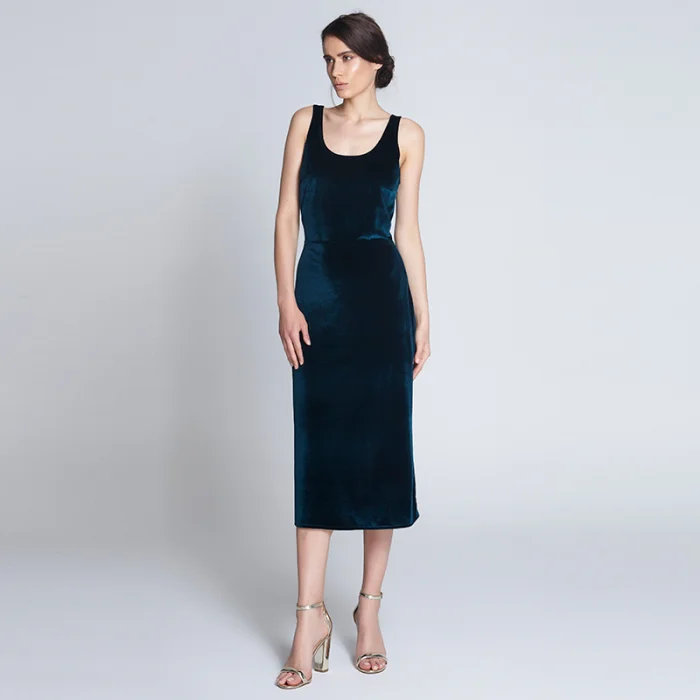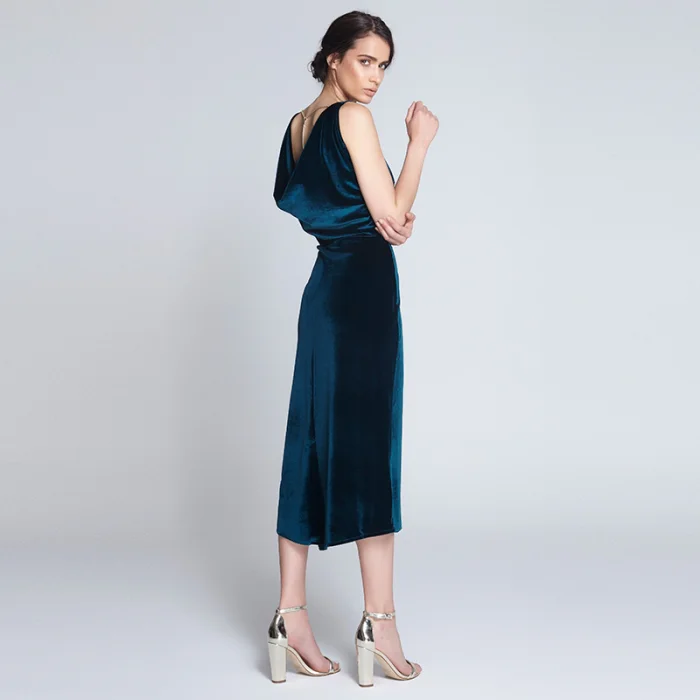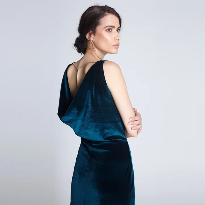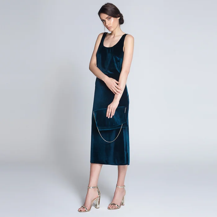 Kadife C-ya nakışlı çantasının içinden çıkan, sırtı degaje V dekolteli, kadife, chanel boy, atlet elbise. Dekoltesinde farklı şekillerde kullanılabilecek 2 adet zinciri mevcut. Tercihen çantada da kullanılabilir.