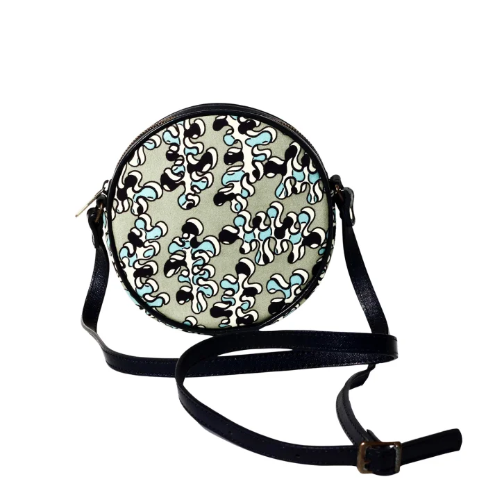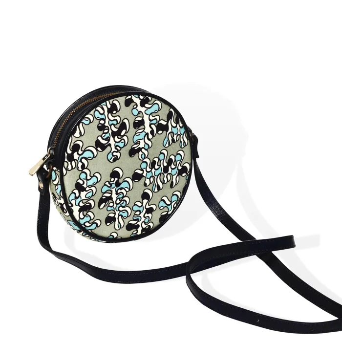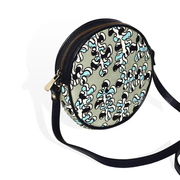 Yuvarlak omuz çantası. Üst kısımda fermuarlı kapama. Ayarlanabilir omuz askısı. Pamuk astar. Toz torbası dahildir. 16x16x5 cm
