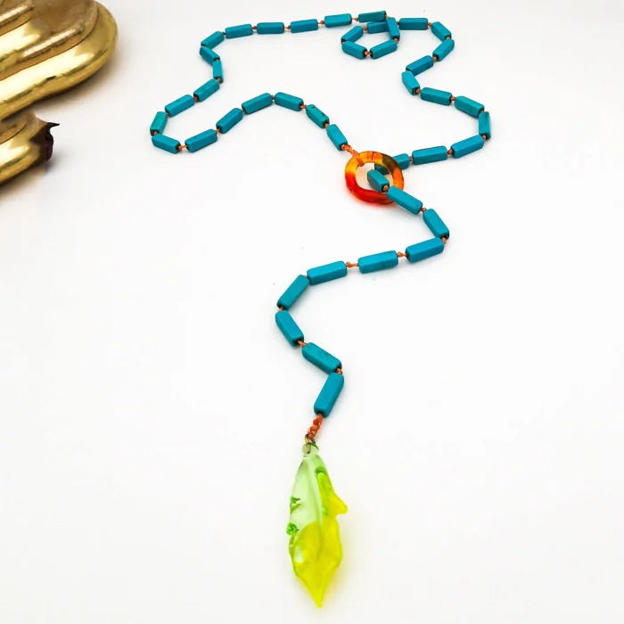 - Murano cam yaprak detayı ile zarif bir dokunuş sunan bu kolye, modern ve şık tasarımıyla göz alıcı bir aksesuar seçeneği; - Turkuaz taşların ışıltısı, mavi renk tonlarıyla birleşerek her kıyafetle uyum sağlayacak renkli bir görünüm kazandırır; - Boncuk kullanımı sayesinde dayanıklılığı artırılmış ve uzun süreli kullanım için ideal bir tercih haline getirilmiştir; - Hem günlük kullanım hem de özel günlerde şıklığınızı tamamlayacak bu kolye, zarafetiyle dikkat çeker;