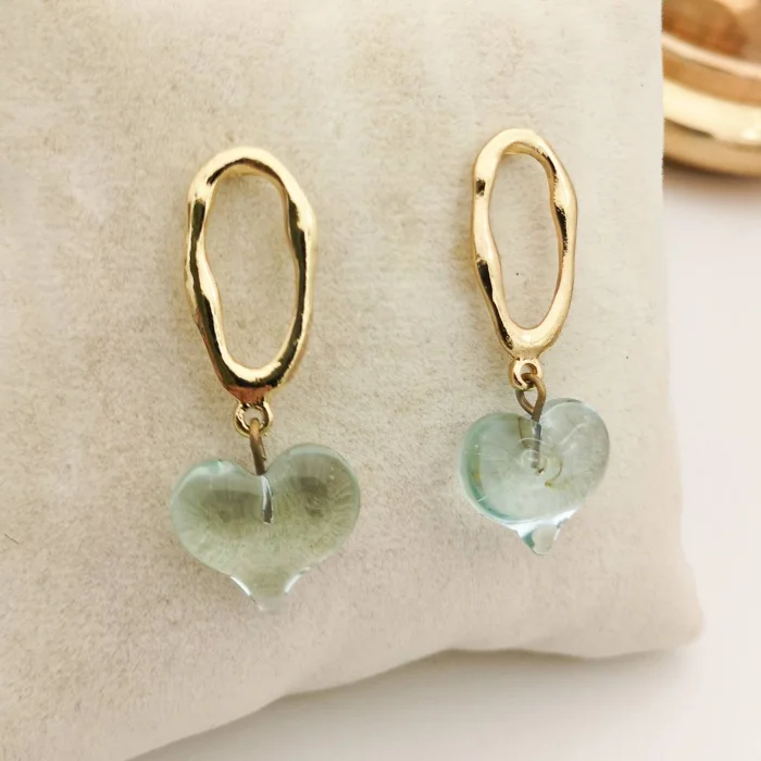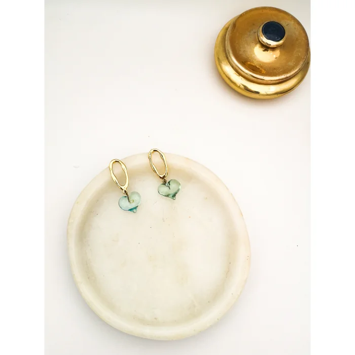Zarif boncuk detaylarıyla süslenmiş, göz alıcı bir tasarıma sahip Murano mavi kalp halka küpe, her kıyafetinizi tamamlayacak şıklıkta; Altın kaplama materyali ile hem dayanıklılığı hem de estetik görünümü bir arada sunar, uzun süreli kullanım için idealdir; Çivi modeli sayesinde modern ve trend bir görünüm kazandırırken, günlük veya özel günlerde rahatlıkla tercih edilebilir;