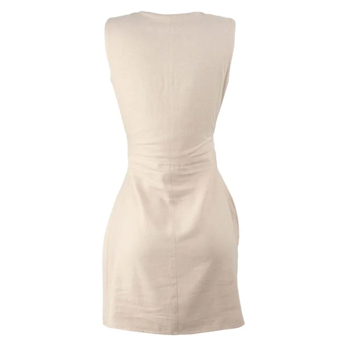 Bej rengi keten elbise. Belden bağlamalıdır. Beli boldur yan kuşakları ile istediğiniz ölçüde bağlayabilirsiniz.